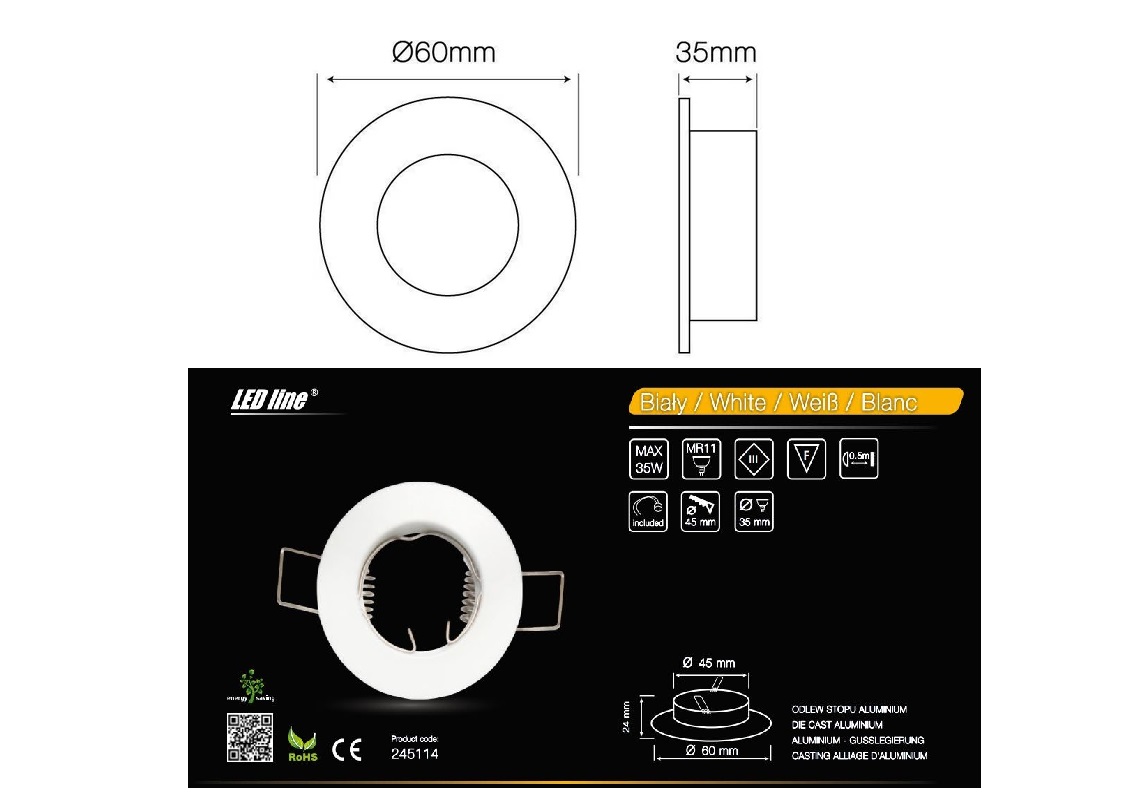 Suitable for installation of LED bulbs MR11 (diameter 35mm). Can be mounted in a hole between 40 and 45mm mounting hole.