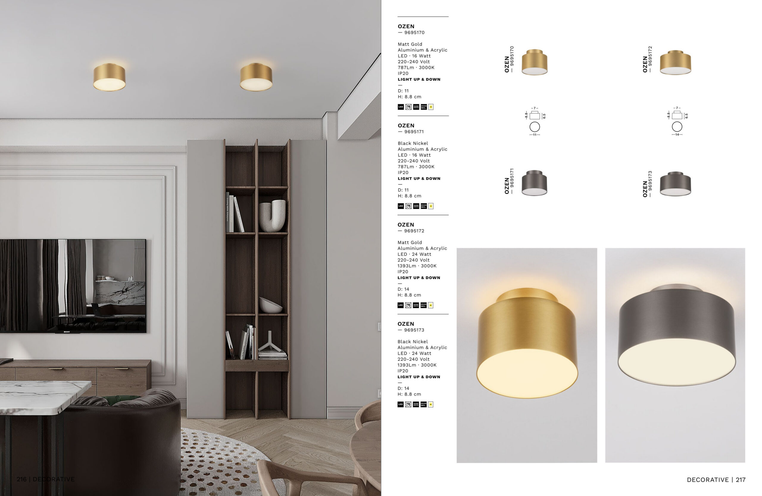 The OZEN ceiling lamp from Nova Luce is an elegant ceiling lamp with a modern, yet subtly classic design. Crafted from gold-colored metal, it consists of two cylindrical elements – a larger lower one and a smaller upper one, giving it a striking, layered design. The lower part of the lamp features a frosted diffuser that gently disperses the light, providing even and pleasant illumination. OZEN is perfect as a stylish lighting element in a living room, bedroom, dining room, or hallway, adding elegance and a modern character to the interior.