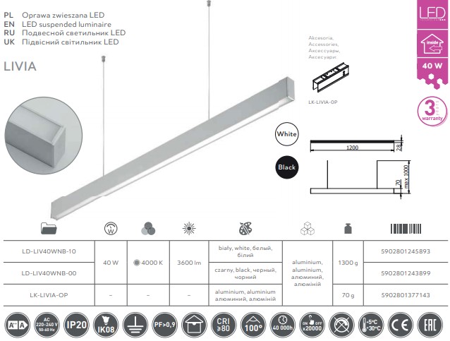 0 out of 5(0)Pinnapealne/ripplamp LINE 120CM 40W LED 100° 3000K/3500K/4000K 4800lm must