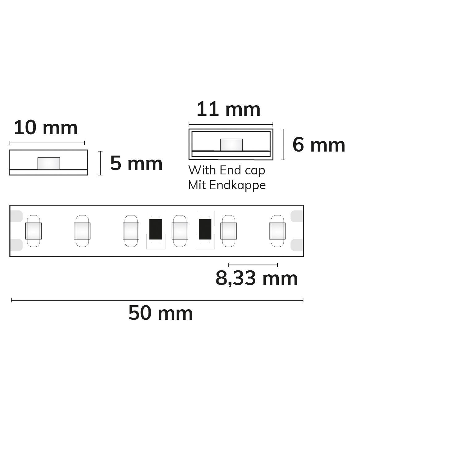 | Special features | Cut point: 50mm with 6 SMD LEDs each | Pitch (center-to-center of light spot): 8.33mm | 1 unit (roll) = 5m | Max. flexible strip length per feed: 5m | Length tolerance + thermal expansion: 1% | No cooling profile required | Includes 3M 300LSE adhesive tape | Clean and degrease the surface before application! Do not remove once applied! | Polyethylene/polyurethane potting compound | SPECIAL FEATURE: Connection cable on both ends |
