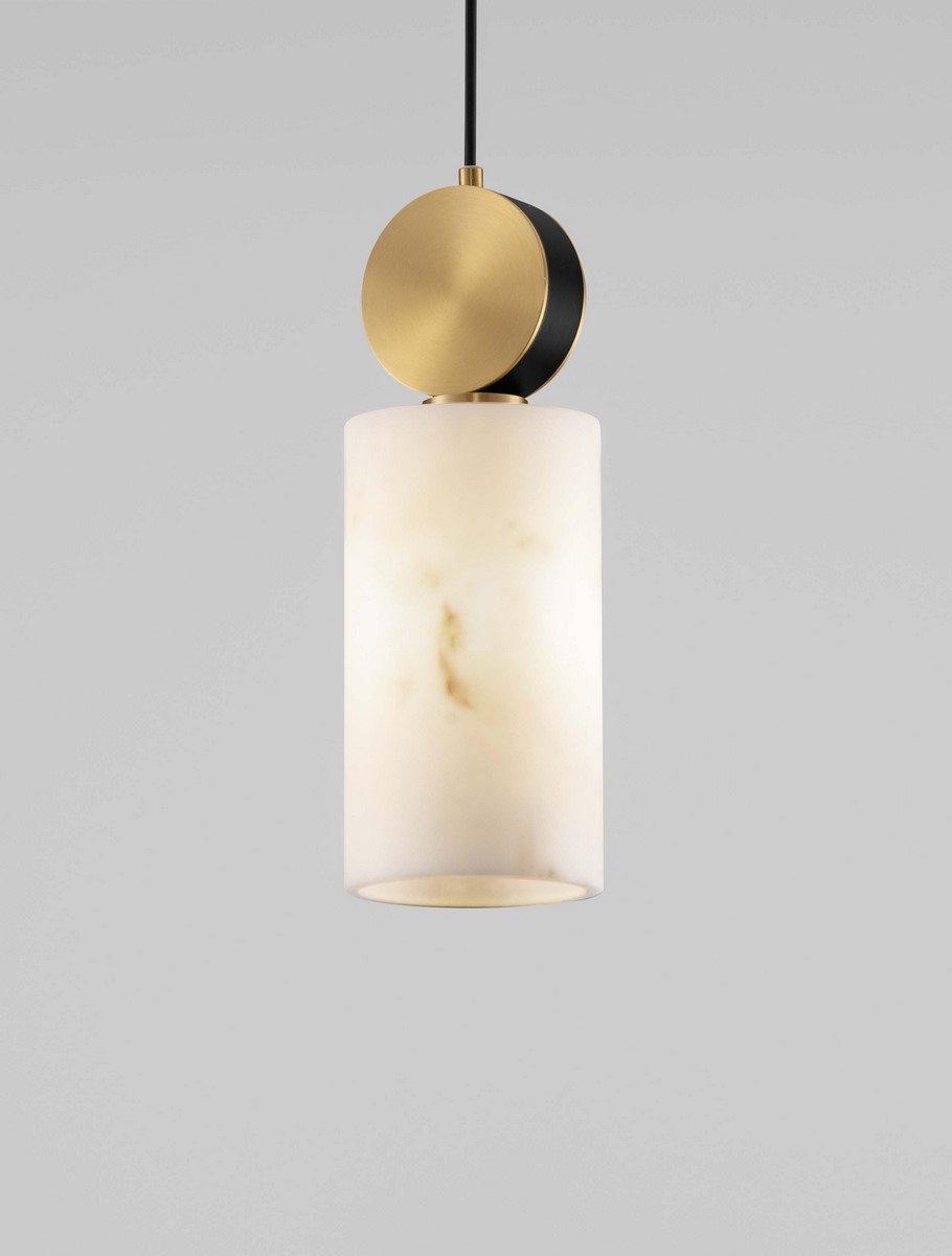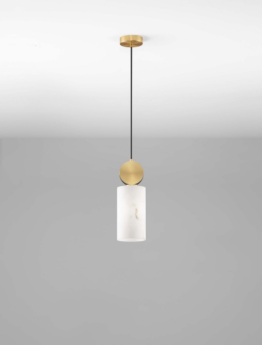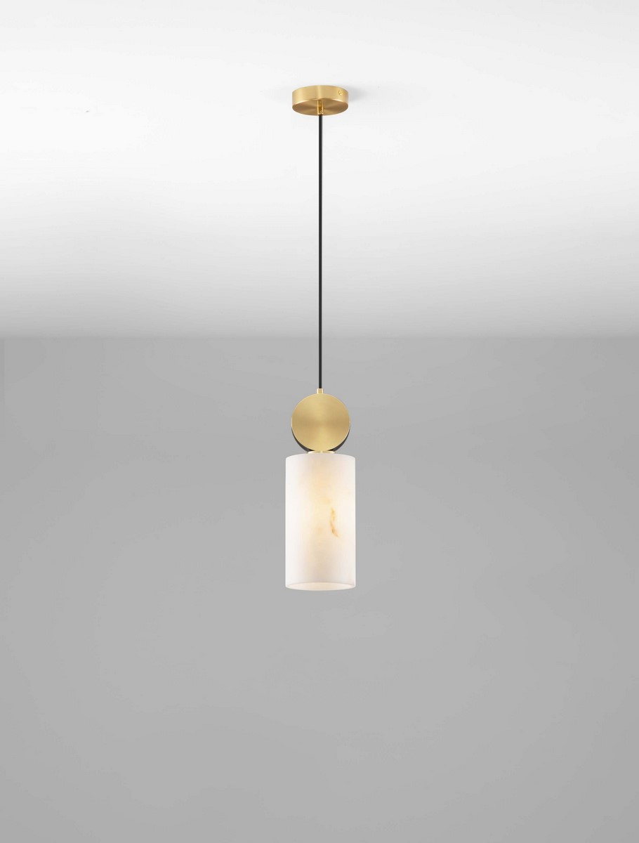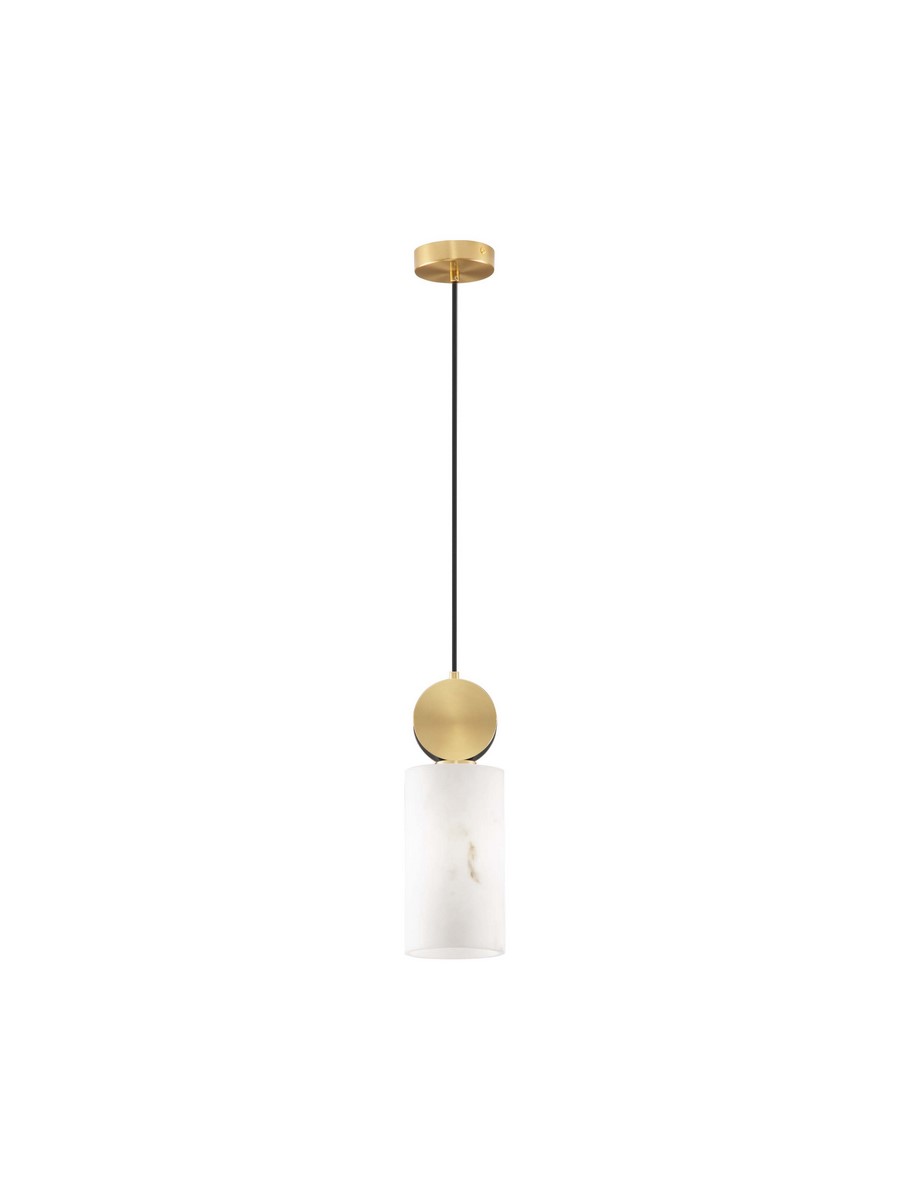 The elegant Nova Luce MARU pendant lamp, with its compact design, is perfect for modern or glamorous interiors. It features a round gold ceiling canopy, from which a striking lampshade made of high-quality alabaster-effect material hangs on a black cable. This lampshade is complemented by a gold ball-shaped detail, adding a refined touch. It works perfectly as a single accent light above a table, kitchen island, or in combination with other lamps, creating an elegant and harmonious arrangement.