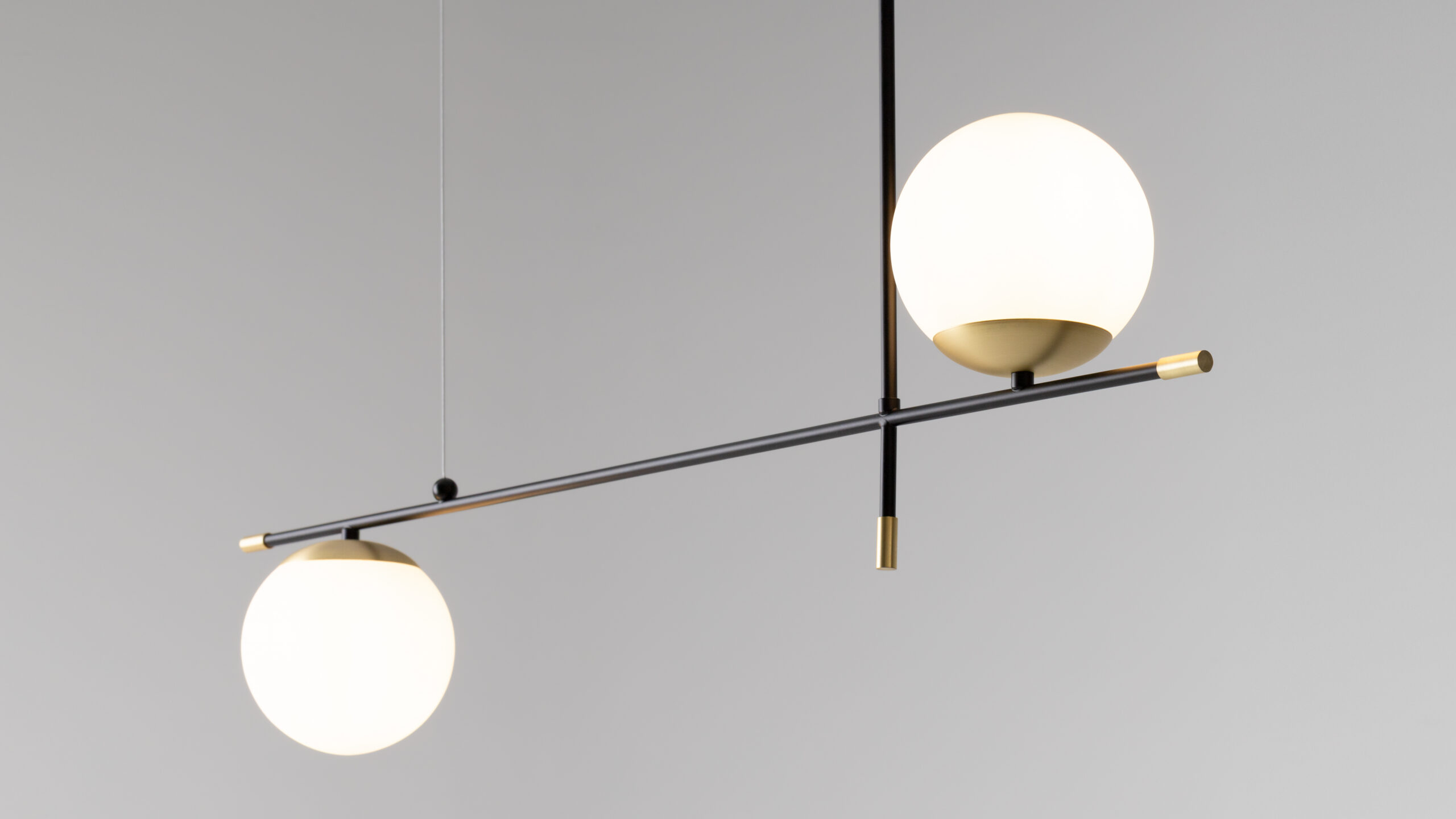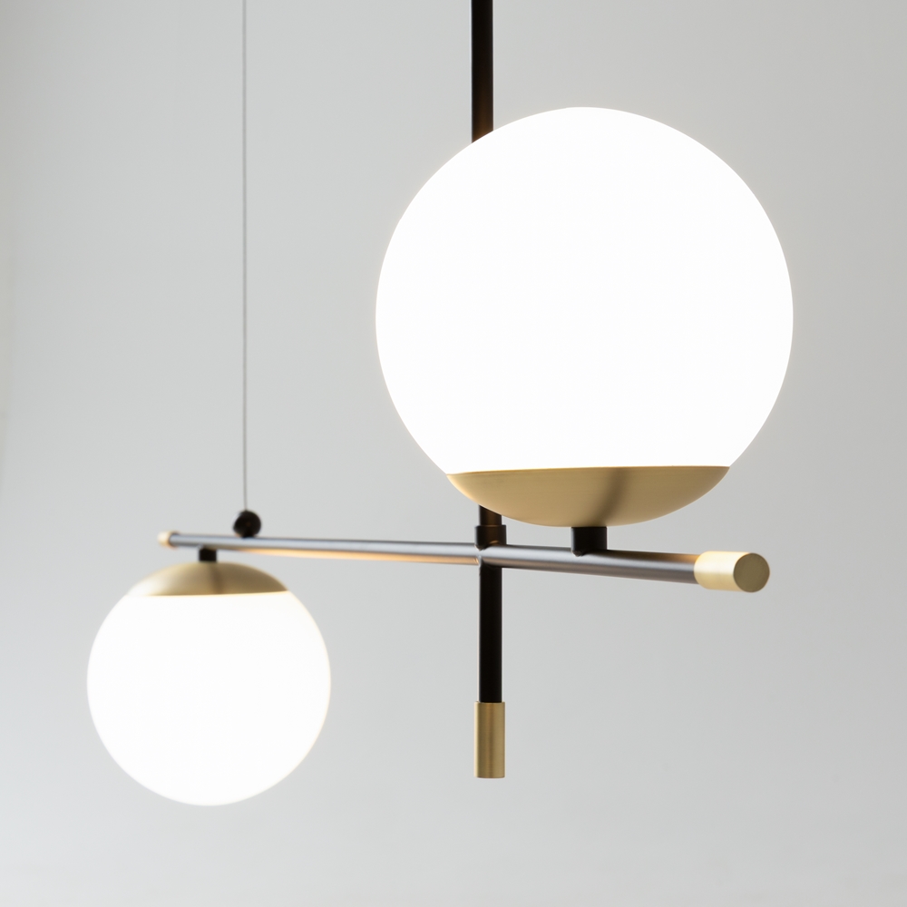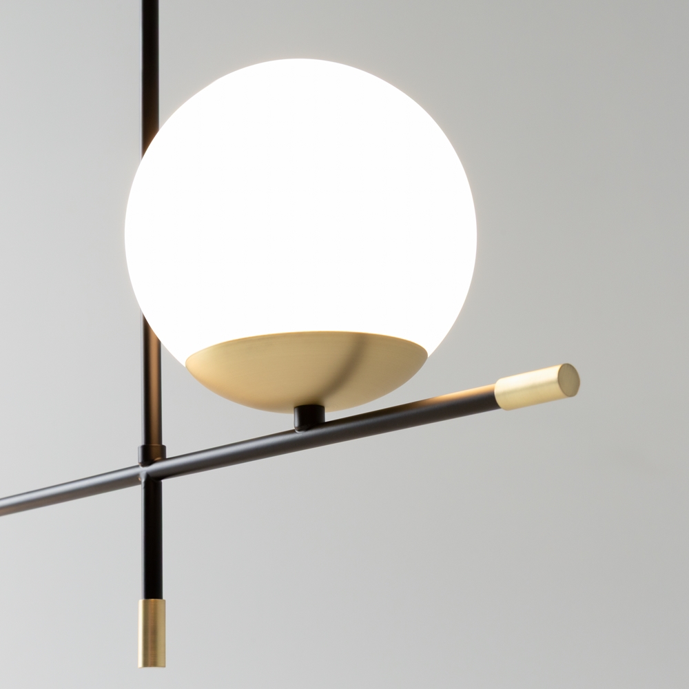 Metal fittings of matte gold color. Spherical dome lamps of frosted blown glass. Fashionable asymmetry in design. Light source — lamps with E14 base.