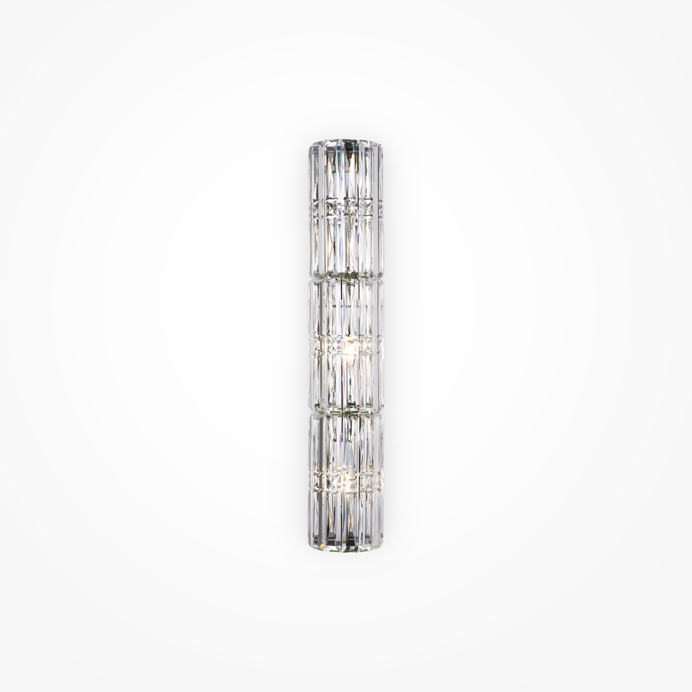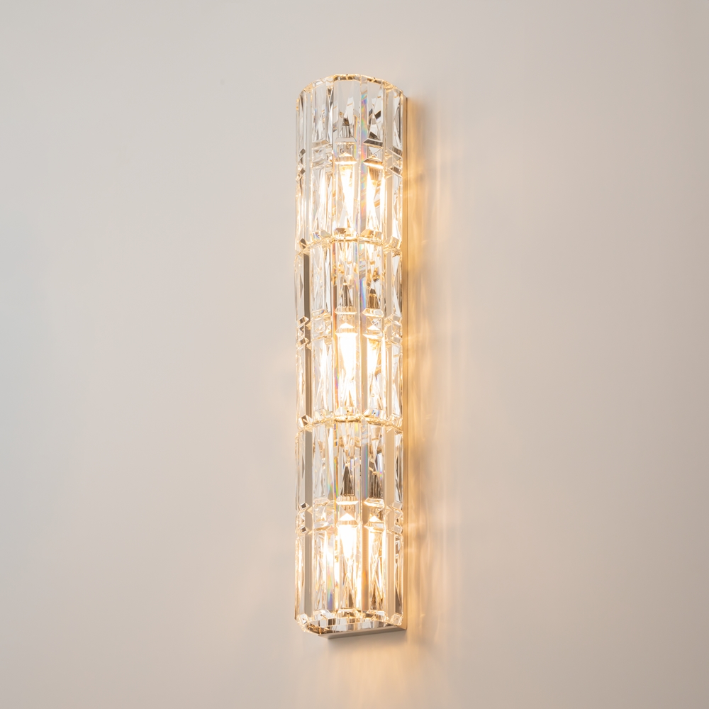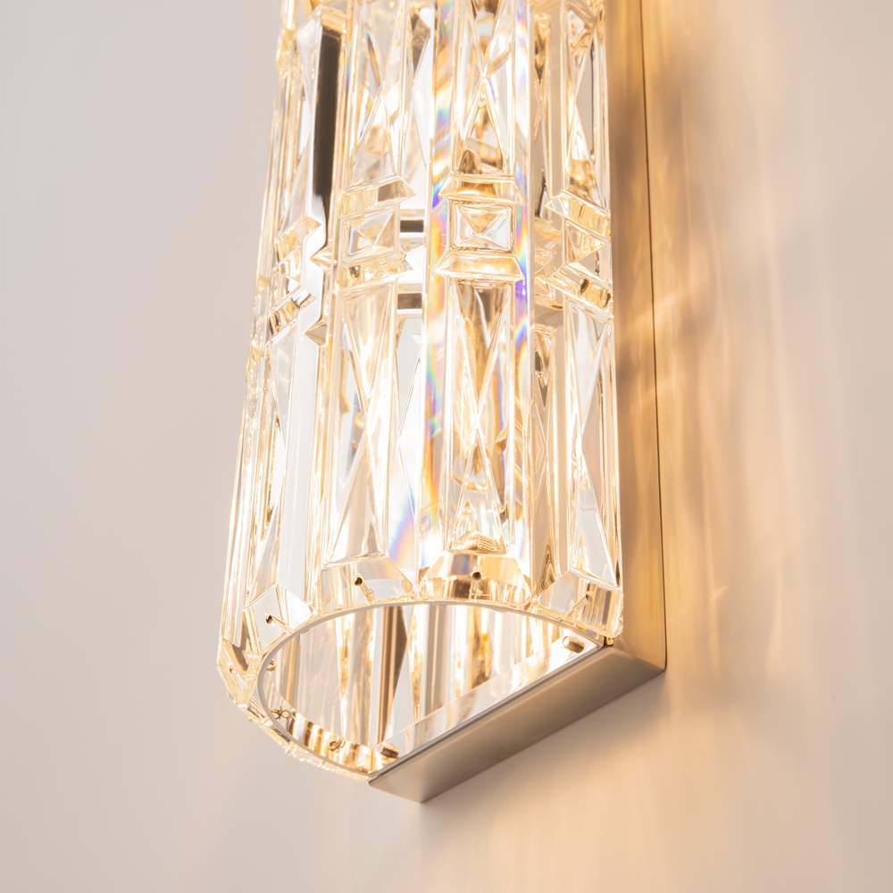 Fittings material— metal, shades — chrome and gold. Decorative elements— transparent glass crystals. Architectural faceting of decorative elements. Light source — lamps with E14 base.
