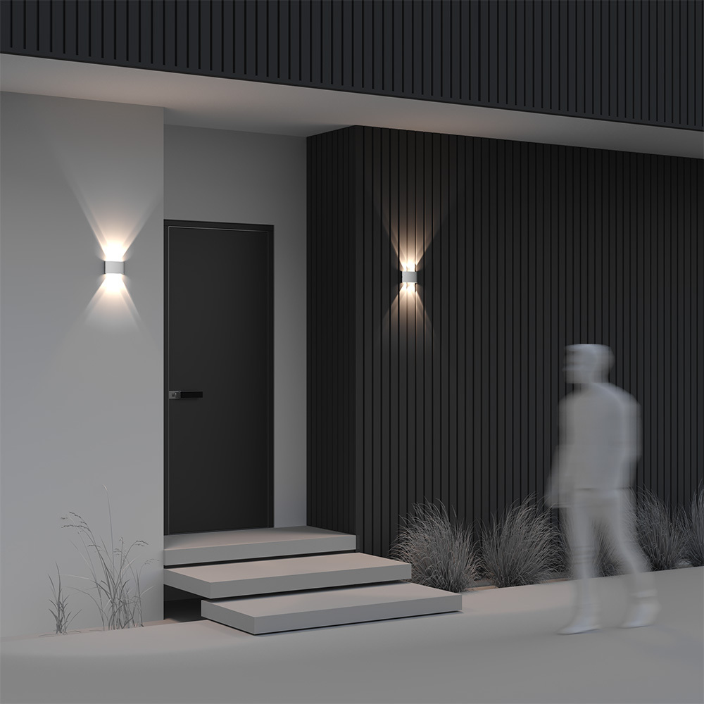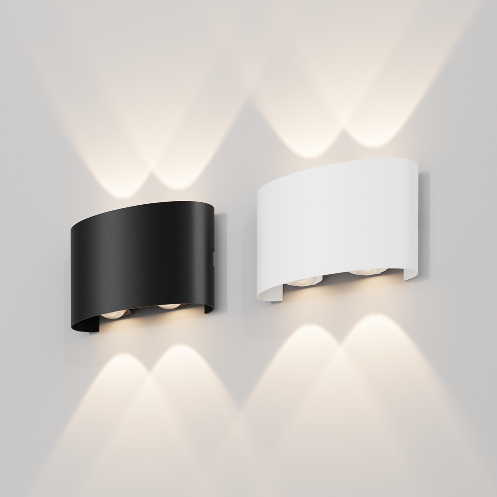Architectural Lighting. Body — metal, shades — black, grey, white. High level IP54. Protection against corrosion and temperature difference. LED source, color temperature is 3000K. Bidirectional light flux, models for 4 and 6 light beams. NEW IP54 LED.