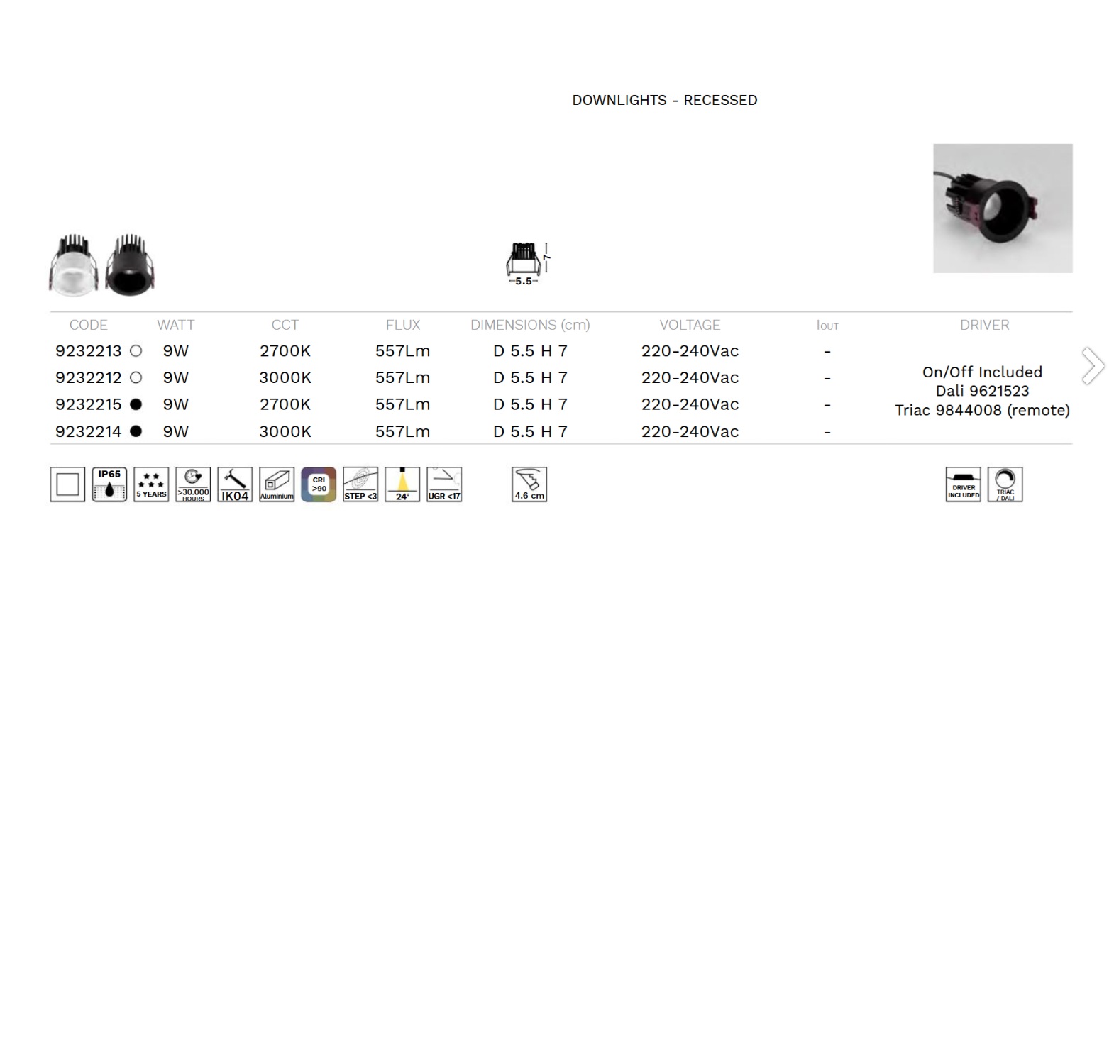Technical Description: Recessed IP65 LED 9W 2700K CRI>90 UGR<17 Beam Angle: 24° 557Lm