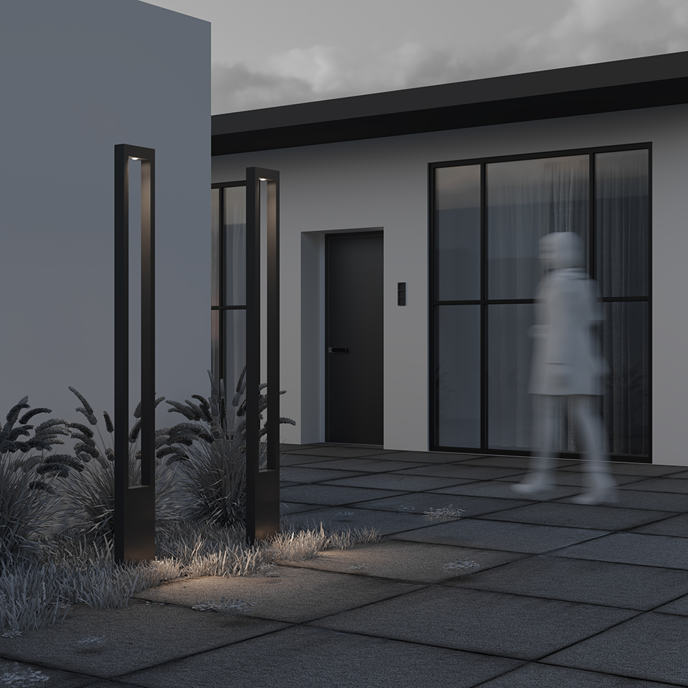 Body material— metal, shade — graphite. Protection against corrosion and temperature differences. High level IP65. Light source — LED module with neutral color temperature of 3000K. Trendy rectangular arch shape. The series includes outdoor lamps of various heights and power.