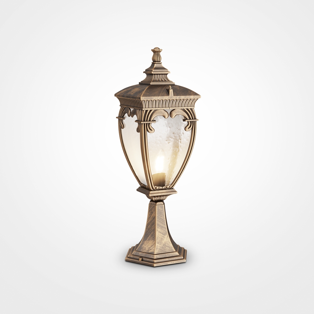 Aluminum housing in two shades: black with gold and antique bronze. Dome light – PULEGOSO glass. Wide range of products: wall, suspended and floor street light fixtures.
