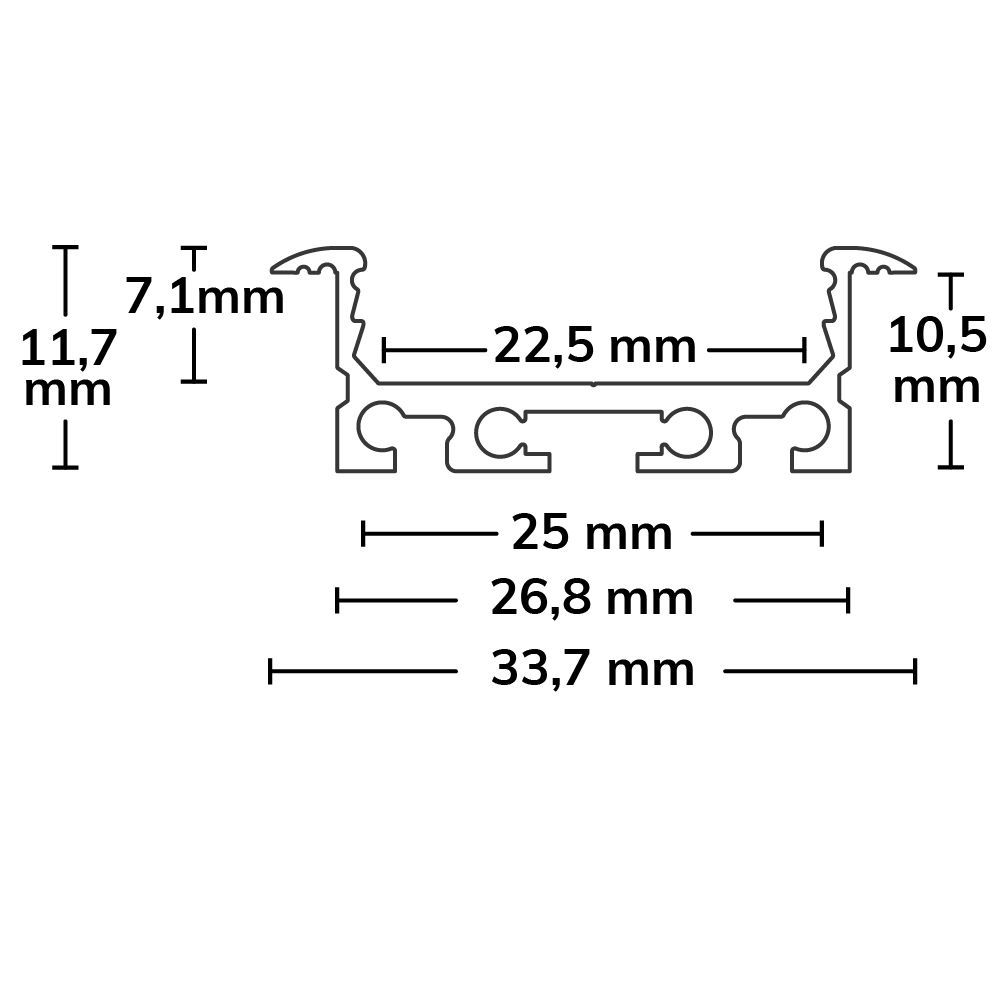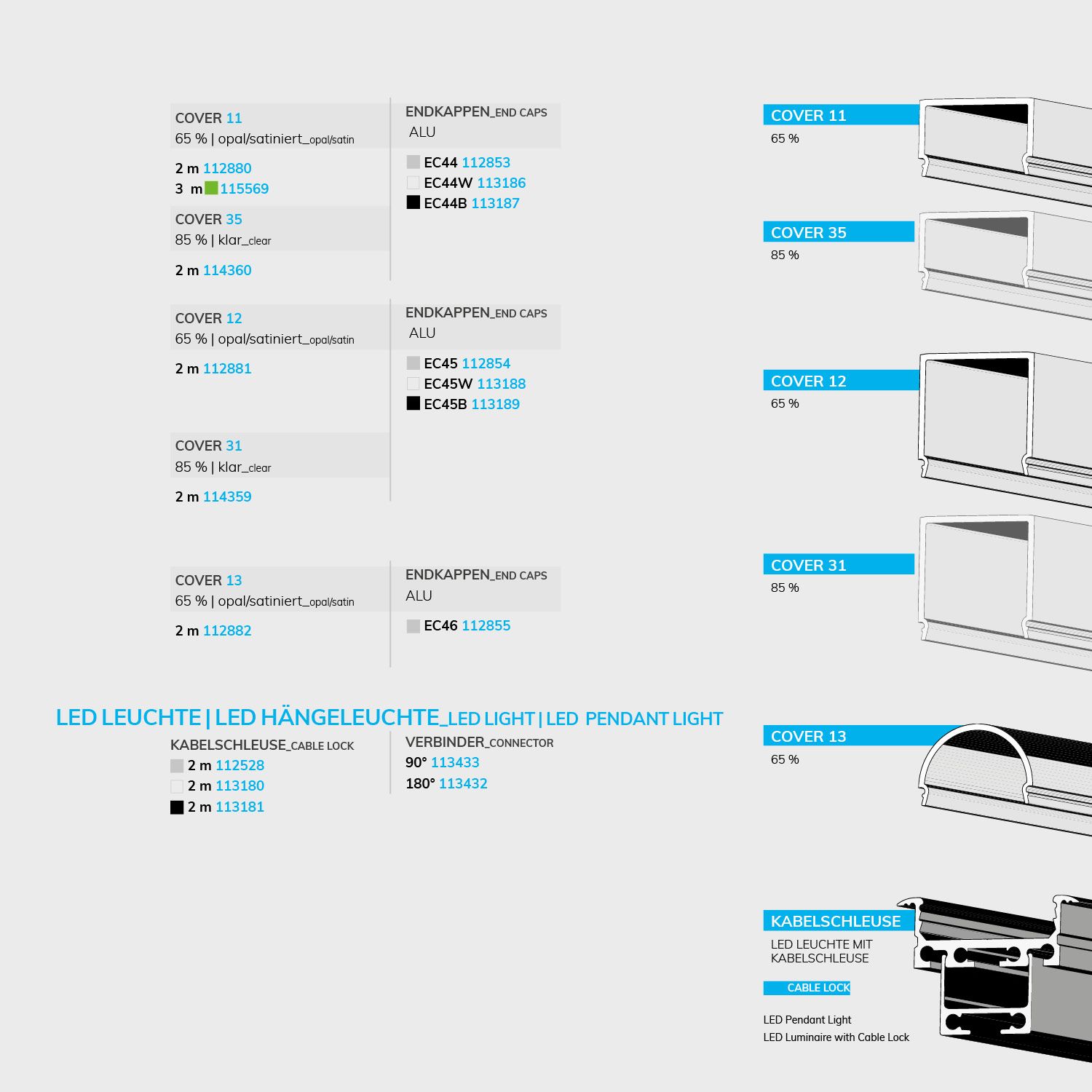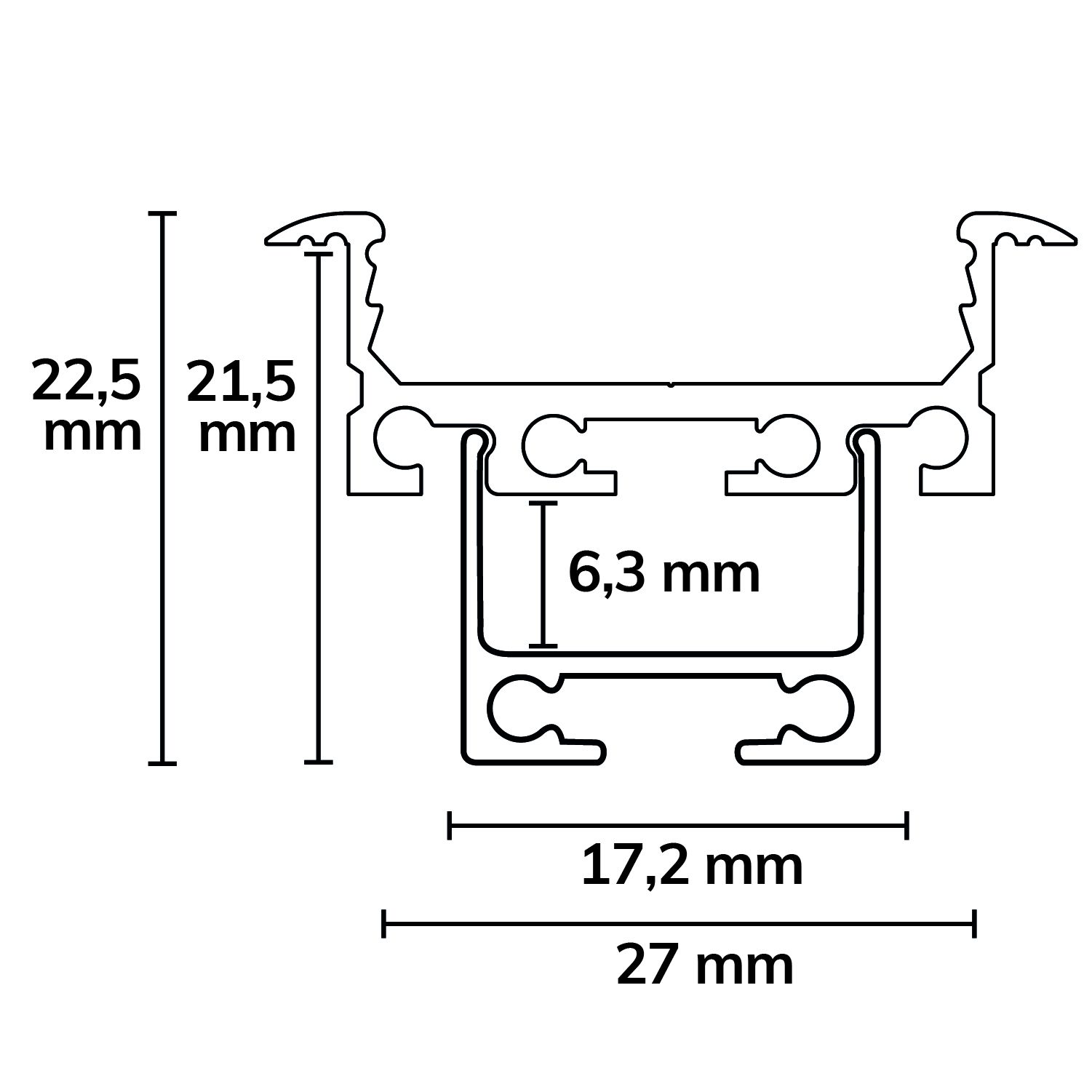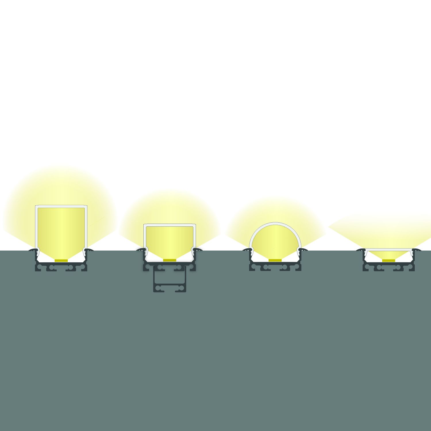 | Special features | Cooling mass = 236 grams/meter, IMPORTANT: Adhesive surface must be degreased before use! Do not use alcohol, spirit or cleaning products for this purpose, but e.g. item 113663! This LED recessed profile has a narrow design, is designed for LED flex stripes with a maximum width of 24mm and is used universally indoors (optionally with the cable lock TUNNEL – item no. 112844). This LED recessed profile can be fitted with four different plastic covers – flat, high, very high or round cover. With the flat cover, the light shines in one direction, whereas with the high, very high and round cover, the light from the LED stripes shines in three directions (including sideways). |