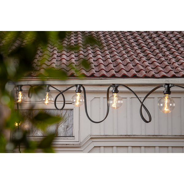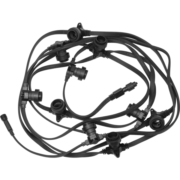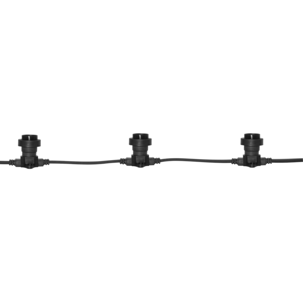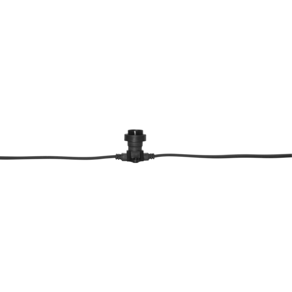 With Connecta party light you can choose and vary the light sources. The light chain is 735 cm long with 10 E27 bases in every 75cm. Requires start cable. For outdoor use. Connectable up to max 2000W / 15W bulbs. Make sure you assemble the light chain so that the weight is properly divided to save the connectors. Over 5m lengths we recomment securing with metal rope