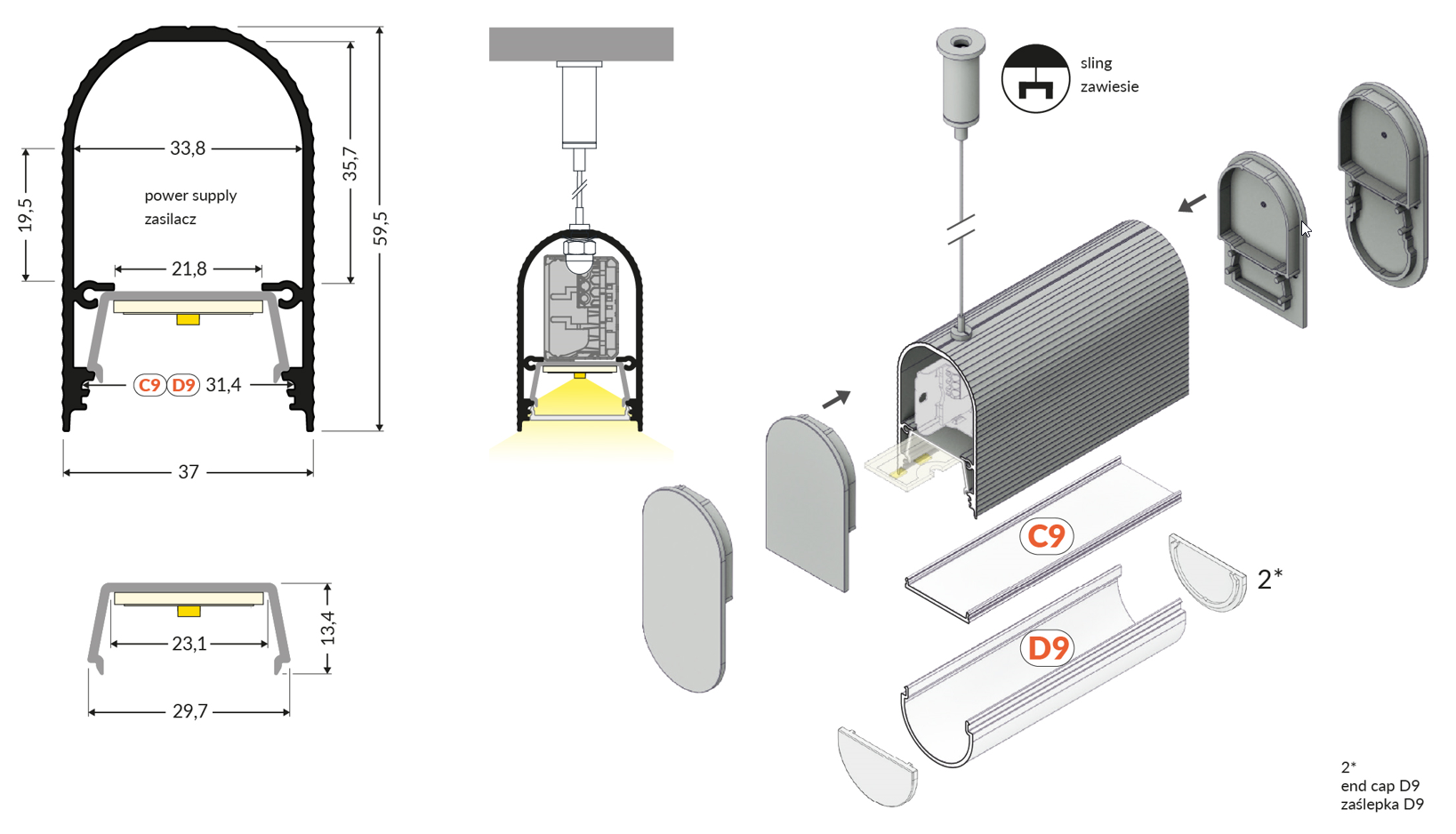 You can create U-shape or oval shape pendant luminaires with this profile and matching compenents.