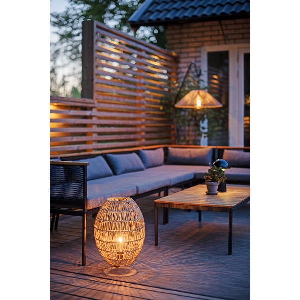 Oat coloured 46cm high Floor lamp shade made of synthetic rattan in PE material for outdoor use. Mix and match with our outdoor cord sets and bulbs. Suitable for E27 cordset and bulb with diameter less than 14cm.